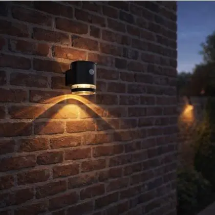 La D’Lite Solis Wall Light si distingue per la sua estetica contemporanea e la funzionalità intelligente. Si ricarica con la luce solare durante il giorno e si attiva automaticamente al rilevamento di movimento. L’illuminazione verso l’alto e verso il basso non solo migliora la visibilità, ma aggiunge anche un tocco decorativo alle pareti esterne.