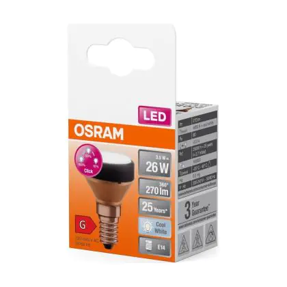La lampada Osram LED Piatto Lamp E14 Special Ghiaccio 3.5W 270lm - 840 Bianco Freddo | A 3 Livelli Dimmerabile - Sostitutiva 25W è il sostituto perfetto per le tue vecchie lampade 25W con attacco a vite piccolo E14 grazie alla sua tecnologia LED. Passare a LED ti offrirà molti vantaggi!